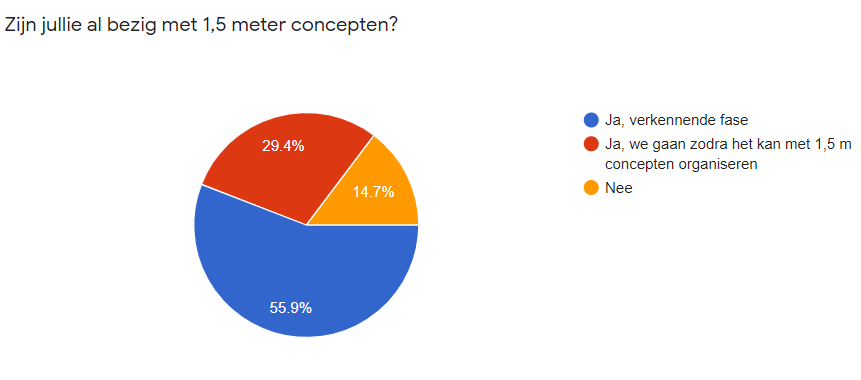 De afkondiging dat vergunningsplichtige evenementen sowieso tot 1 september geen doorgang kunnen vinden, betekent niet dat de besloten zakelijke evenementen tot die tijd eruit liggen. Nieuws daarover volgt 20 mei. Maar ondertussen blijft er gesproken worden over de anderhalve meter maatschappij, zien opdrachtgevers daar wat in? Ja, lijkt zo op het eerste gezicht: 3 op de 10 gaat meteen bezig met 1,5 meter concepten als het mag en ruim de helft verkent de mogelijkheden: