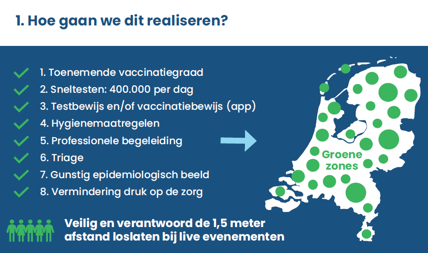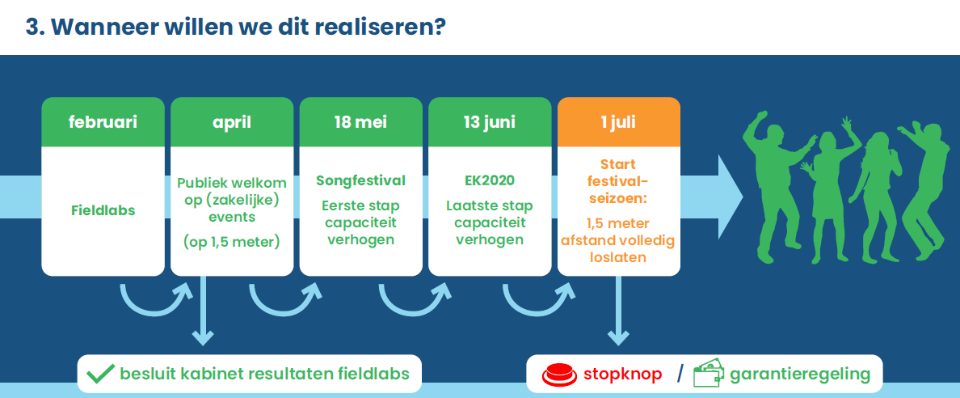 De branche wil in april publiek welkom heten op anderhalve meter afstand, in mei tijdens o.a. het Eurovisie Songfestival een volgende stap zetten en in juni weer een stap zetten rondom het EK voetbal. Dan moet op basis van sneltesten de capaciteit naar 50% of zelfs 70% van de reguliere bezoekersaantallen worden gebracht.
