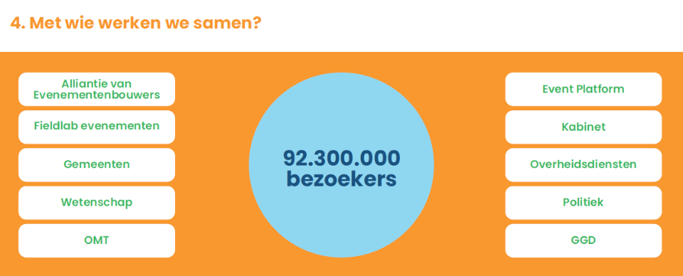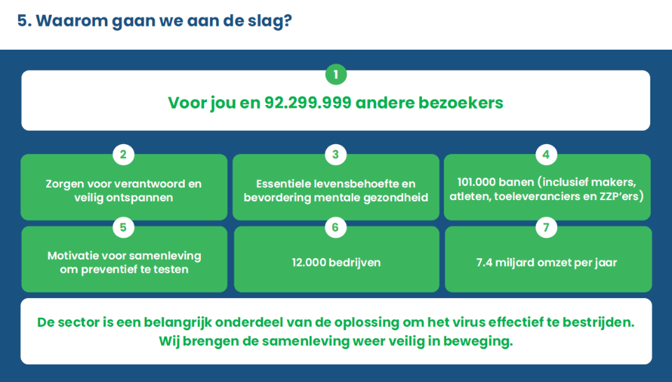 Onze branche is op het gebied van evenementenorganisatie een onomstreden voorloper in de hele wereld. Wij bepalen daar de toon, wij hebben de expertise en kunde om evenementen juist ook in deze tijd veilig te organiseren. Wij kijken naar wat wel kan, in plaats van wat niet kan. Wij zijn een belangrijke onderdeel van de oplossing om Nederland van het slot te halen en mensen weer op een veilige manier ontspanning te bieden. Nederland stelt daarom een heldere ambitie vast: