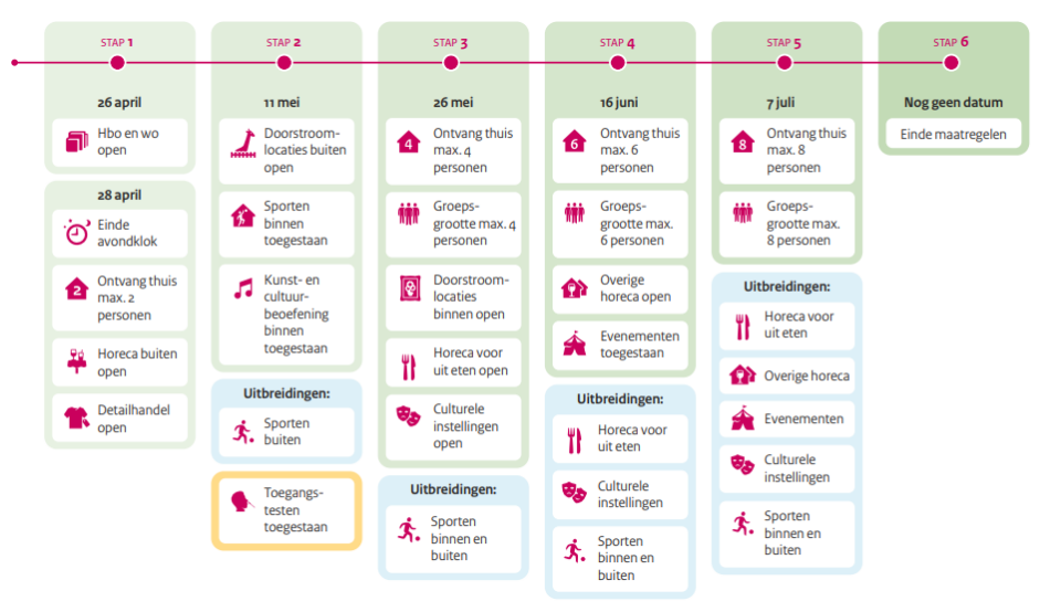Nogmaals, wat de stappen exact gaan inhouden is nog onduidelijk, maar het biedt toch de eerste echt houvast en een begindatum van 26 april. Op Rijksoverheid.nl wordt daar het volgende over gezegd: